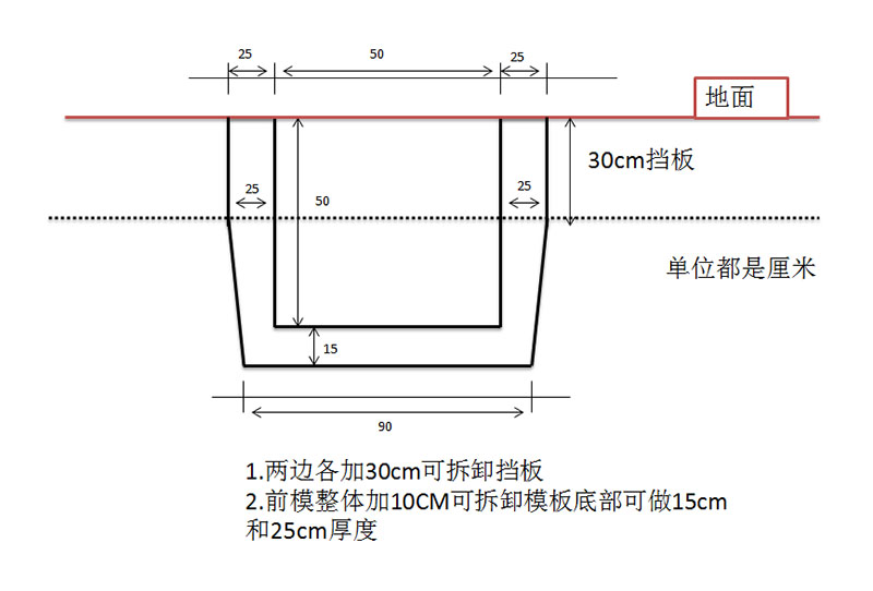 這個圖紙和客戶的標準不同,是經過協商后的結果,這樣做的好處是能夠省下一部分混凝土,而水渠邊溝的內部大小并沒有改變。而且經過加長擋板的設計以后,機器可以在沒有土模的支持下,懸空打水渠。